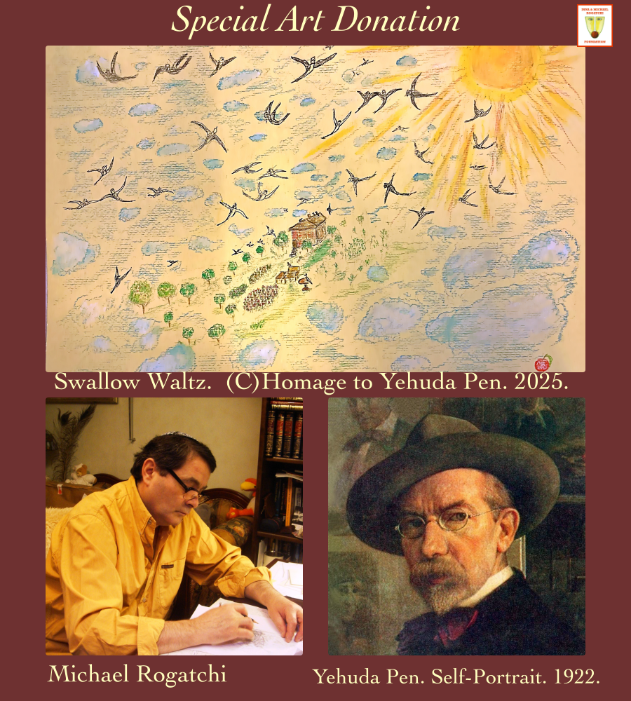 Two donated original works, one by Michael and one by Inna Rogatchi, are homages to Yehuda Pen. Michael’s work, Swallow Waltz ( 2025 ), from his Alone But Not Lonely series, is a lyrical interpretation of memories of one’s home , in this case, of Yehuda Pen who has kept cordial feelings and warm memories and a heart-thread towards the place where his family lived and where he was born.