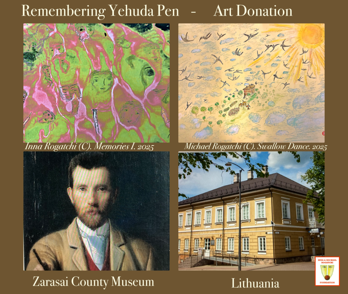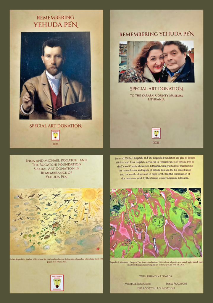 Michael and Inna Rogatchi donated original artworks which will become the part of the permanent exposition at the Zarasai County Museum in Lithuania will be on display at the museum’s room dedicated to Yehuda Pen, from October 2026 onward. “ The artistic homages of Michael and Inna Rogatchi to Yehuda Pen will be exhibited in the Yehuda pen room of the museum as the part and the way of the artistic and humane dialogue” – according to the Zarasai County Museum.