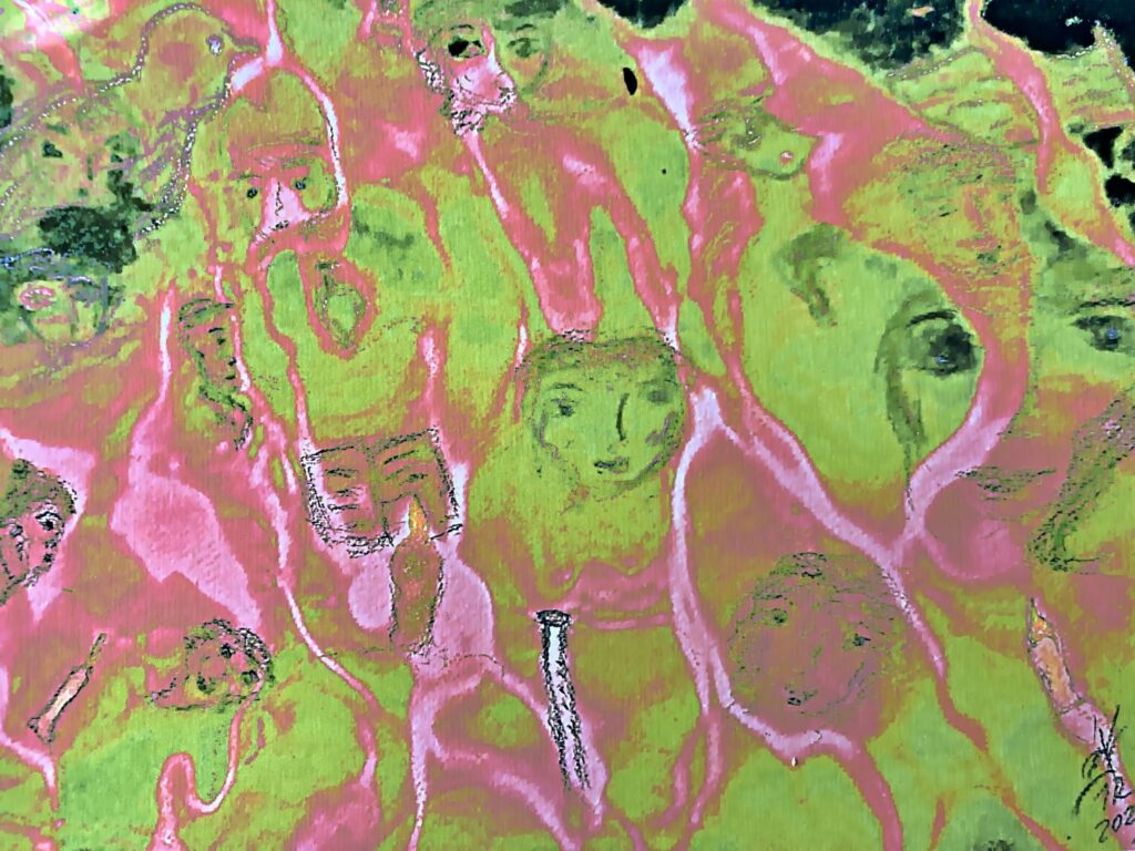 Inna Rogatchi ©. Memories I. Songs of Our Souls. Pigments, watercolour, oil pastel, wax pastel, Luminance Caran d’Ache on authored original print on cotton paper. 30 x 40 cm. 2025. Zarasai County Museum, Lithuania. Donation by the artist in memory of Yehuda Pen. 2026.