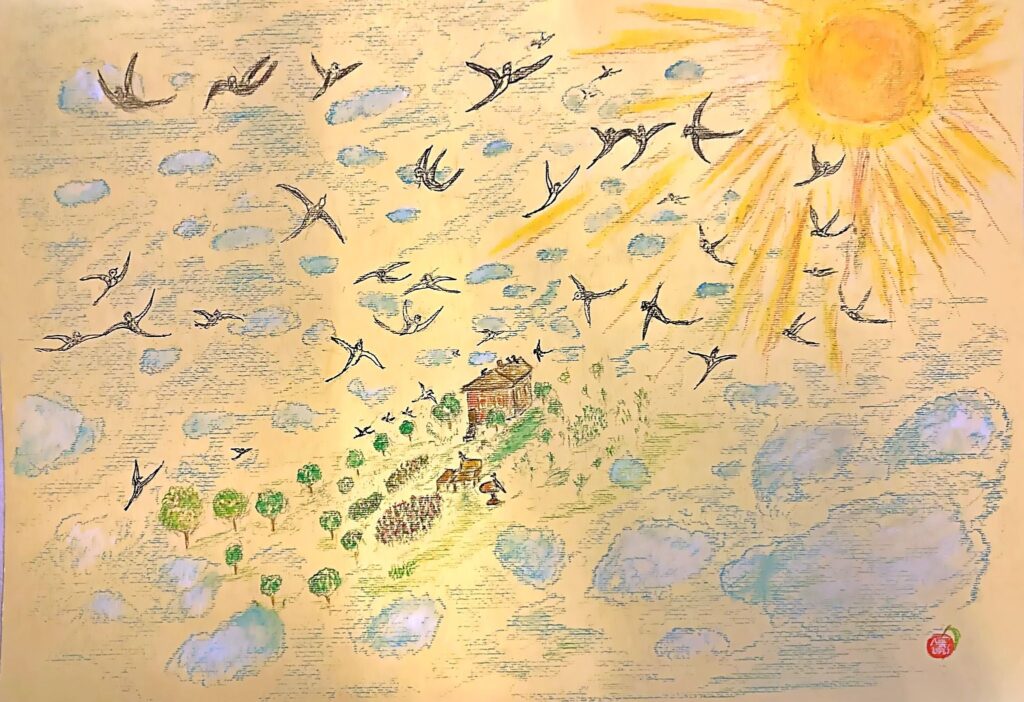 Michael Rogatchi ©. Swallow Waltz. Alone But Not Lonely. Indian ink, oil pastel on yellow hand-made cotton paper. 35 x 50 cm. 2025. Zarasai County Museum, Lithuania. Donation by the artist in memory of Yehuda Pen. 2026.