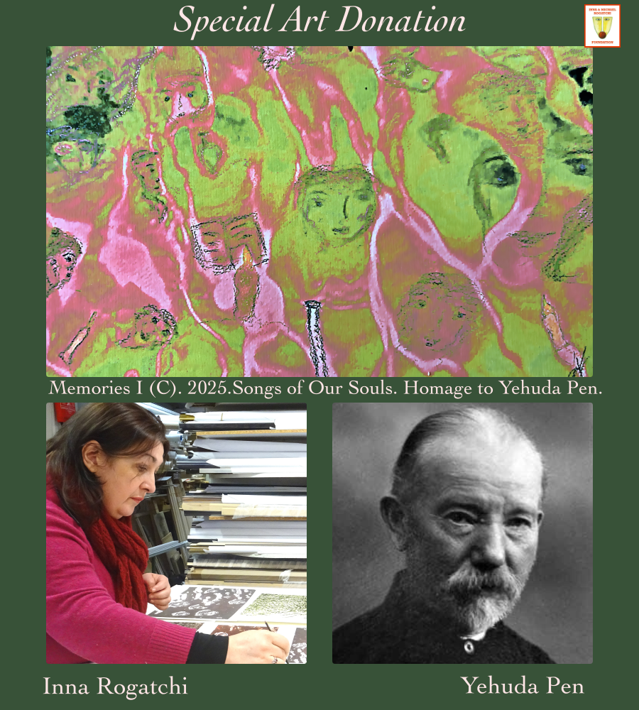 Inna Rogatchi’s work, Memories I ( 2025), from her Songs of Our Souls series, reflects on Yehuda Pen’s very difficult life, especially after the revolution and in his late years , his tragic and cruel death, and the dramatic destiny of three quarters of his artistic legacy.